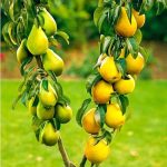 H=2,3m.; uz viena potcelma uzpotētas divas kolonbumbieres; ''Saphira'' dzeltenzaļa- vienā pusē, ''Decora'' sarkanbrūna- otrā pusē; izskatās dekoratīvi un arī augļi garšīgi un deserta.
